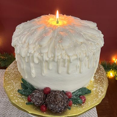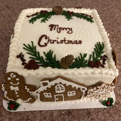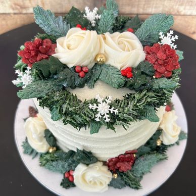 Custom buttercream poinsettias and fondant cones on top. Center poinsettia on front is gum paste and not edible. Center poinsettia is only available by special order.