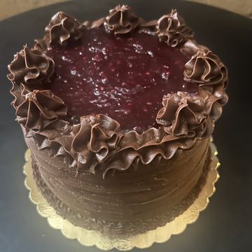 6” 2 layer chocolate cake with chocolate buttercream in between layers and raspberry filling on top.