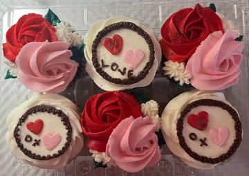 Red Velvet Cupcakes with Buttercream Icing and heart shaped Jimmie’s.